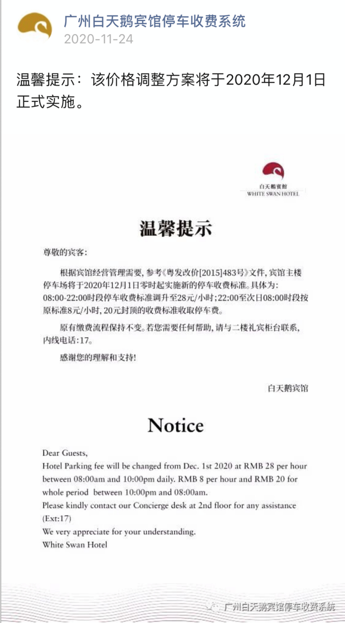 11月24日,白天鹅宾馆在其停车场收费公众号“广州白天鹅宾馆停车收费系统”对外发布最新停车价格调整方案。根据方案显示,从2020年12月1日零起,白天鹅宾馆在08:00-22:00时段停车收费标准调升为28元/小时。方案上指出,宾馆是根据经营管理的需要,参考《粤发改价[2015]483号》调整停车收费标准。