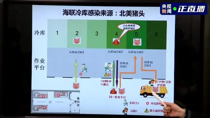 这里面有一个关键性的人物是装卸工,138号病例(搬卸工),入库的猪肘是他搬卸的,同时入2号库猪头也是他搬卸的,但是入5号库的猪头他没有进行搬卸。