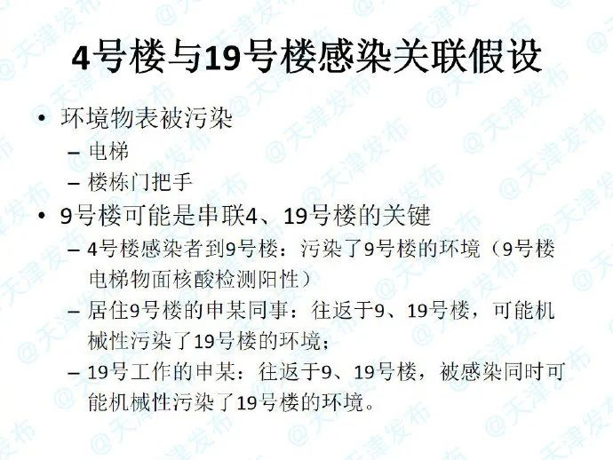 住在9号楼的申某的同事往返于19号楼跟10号楼,因为这是申某的老板,他的公司办公地点在19号楼,很可能通过他的手部污染或者是其他的污染机械性把病毒带到19号楼,同时申某自己也是不断往返于9楼和19号楼之间。