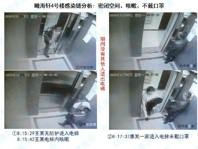 近日,天津东疆港区瞰海轩小区接连出现8名新冠肺炎病毒感染者,针对这起疫情,天津市疾控中心副主任张颖今天公布了该小区病毒追溯结果。经多日追踪发现,小区首个感染者曾乘坐电梯时未佩戴口罩,并在电梯的密闭空间中咳嗽、打喷嚏,污染了电梯环境,进而导致小区内其他居民被感染。