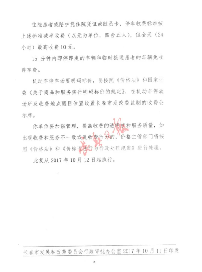在保证医院院内车辆正常通行和防火安全的情况下,来医院看病的患者或陪护凭看病凭证或随员卡,停车收费标准仍按长发改审批字【2011】176号文件执行。