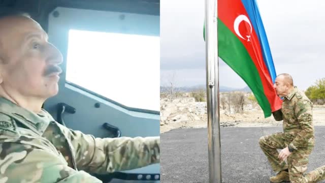 阿塞拜疆总统在纳卡地区升起并亲吻国旗#当地时间23日,阿塞拜疆总统阿利耶夫携副总统妻子前往纳卡阿格达姆视察。画面显示,阿利耶夫亲自驾驶军车。第一夫人兼副总统阿利耶娃将这段视频上传至社交网络。早在17日,阿利耶夫就同妻子一同前往纳卡地区,受到当地民众的热烈欢迎。到达阿格达姆后,阿利耶夫还升起阿塞拜疆国旗,并单膝跪地亲吻国旗。