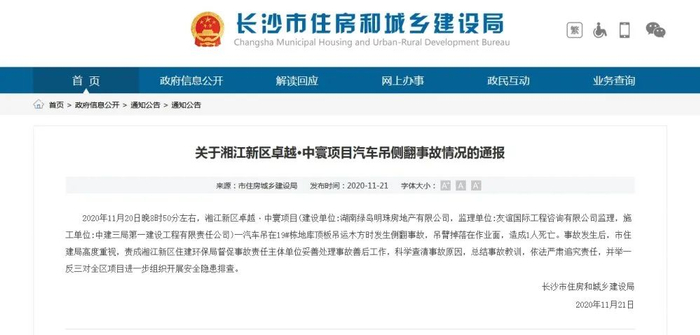 2020年11月20日晚8时50分左右,湘江新区卓越·中寰项目(建设单位:湖南绿岛明珠房地产有限公司,监理单位:友谊国际工程咨询有限公司监理,施工单位:中建三局第一建设工程有限责任公司)一汽车吊在19#栋地库顶板吊运木方时发生侧翻事故,吊臂掉落在作业面,造成1人死亡。事故发生后,市住建局高度重视,责成湘江新区住建环保局督促事故责任主体单位妥善处理事故善后工作,科学查清事故原因,总结事故教训,依法严肃追究责任,并举一反三对全区项目进一步组织开展安全隐患排查。