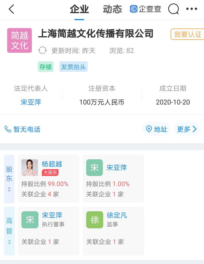 企查查APP显示,上海简越文化传播有限公司成立于2020年10月,所属行业为新闻和出版业,杨超越为该公司最大股东(持股99%)、实际控制人、最终受益人。