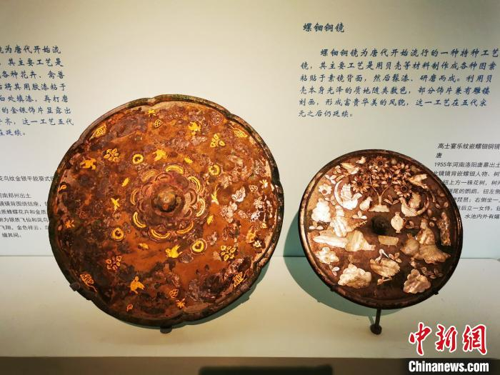 左为唐代羽人花鸟纹金银平脱葵式铜镜,镜背围绕钮座错落分布着银质蜂蝶花卉和金质鸟鹊,其外侧为银质飞仙和凤鸟间隔沿镜缘飞翔,金色祥云、鸟鹊和花叶点缀其间。右为唐代高士宴乐纹嵌螺钿铜镜。镜背嵌螺钿人物、树木等。钮上方一株花树,树两侧各一振翅翘尾的鹦鹉。钮左侧端坐一人,手弹琵琶;右侧坐一人,手持酒盅,背后立一侍女。钮下有仙鹤、水池,水池内外有嬉戏的鹦鹉。 应妮 摄