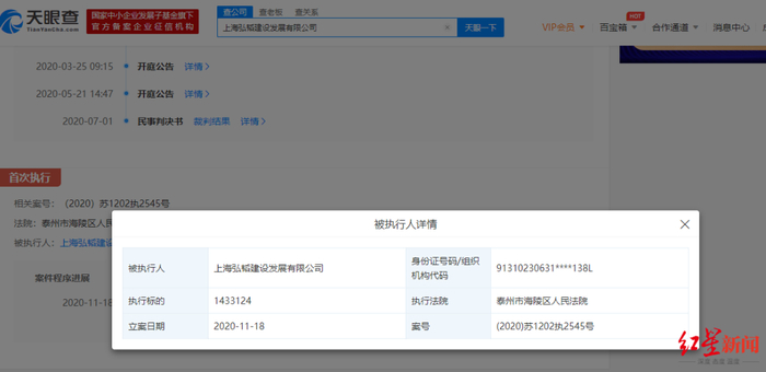 天眼查APP显示,该案件由泰州市海陵区人民法院审理,相关案号为(2020)苏1202执2545号,被执行人为弘韬公司。根据其案件程序进展来看,11月18日,该公司执行标的为1433124元。