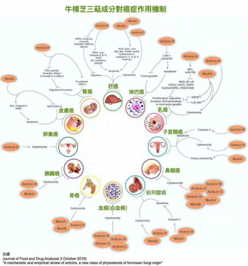 事实上象许多中药具有明确的药理一样,牛樟芝抗击肿瘤的机理非常清晰,世界著名学术期刊《ScienceDirect刊登的一篇长篇论文,直观地用一幅图把牛樟芝三萜直接击杀多种癌细胞,抑制肝癌、肺癌、胃癌、结直肠癌、淋巴瘤、乳腺癌、子宫颈癌、头颈癌、前列腺癌、白血病、骨癌、胰腺癌、卵巢癌、卵巢癌、皮肤癌、肾癌……的几十条路径清晰地展现出来。从西医更容易认知的角度为中药牛樟芝加入肿瘤治疗整合医学奠定了基础。