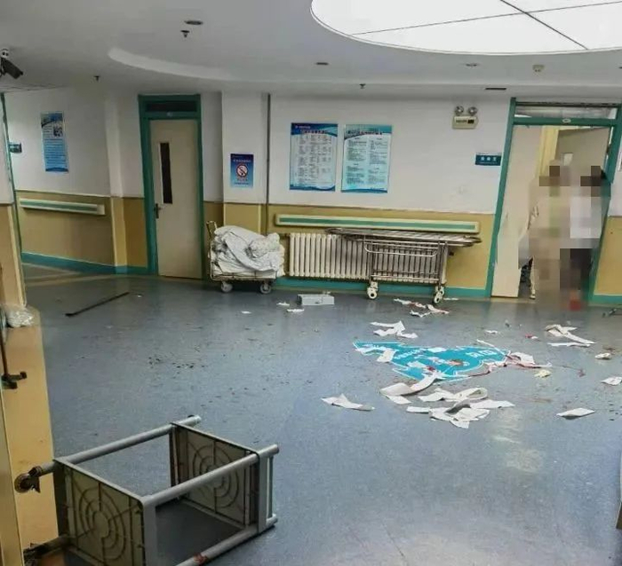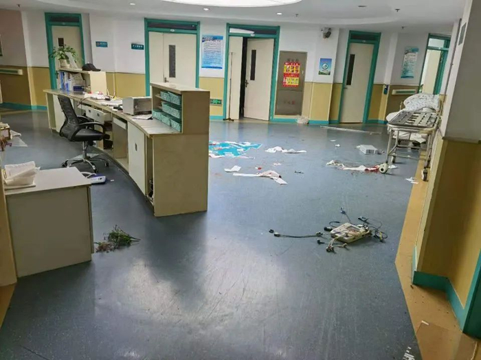 一段事后拍摄的现场画面显示,护士站的两台电脑显示器、打印机、打码机和固定电话,或倒在工作台上或散落在地上,心电图机器分体,手推车翻倒在地一个轱辘脱落,用来转运病人的板车上的一根钢管也落到了地上。另外护士站所在的三角区以及部分病房门口,到处能看到血迹。
