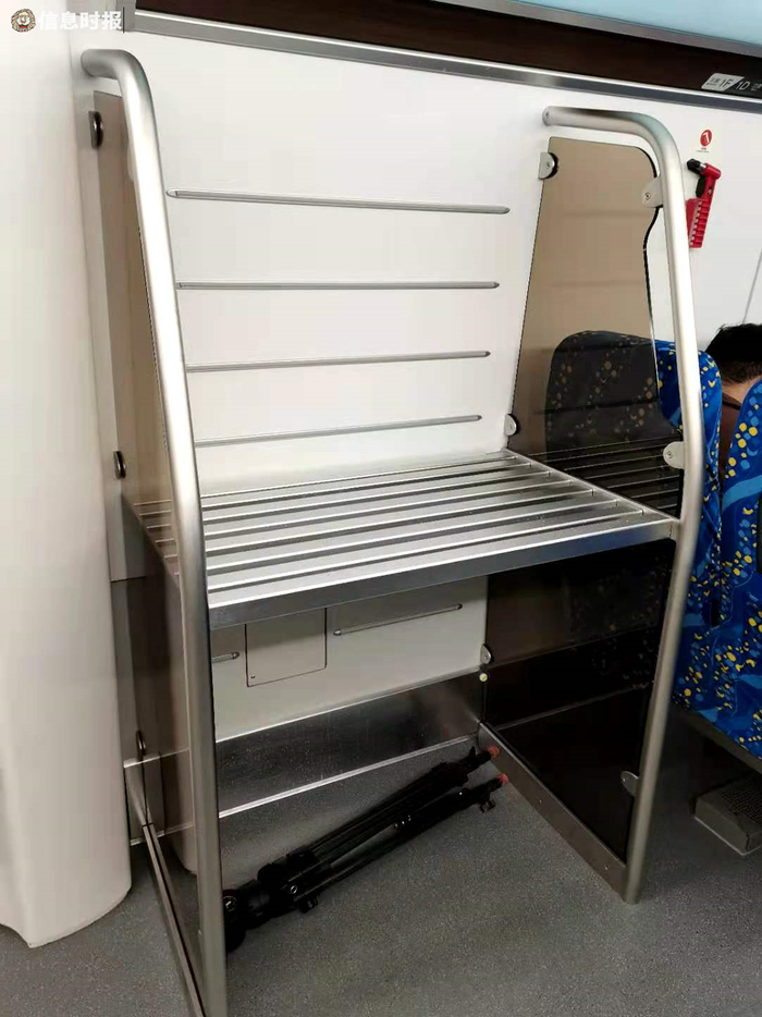 每节车厢中间还设置含有小桌板的爱心座椅,可放置水杯、电脑等物品;座椅上方设有行李架,可放置旅客携带的小件行李;每节车厢设置大件行李架,旅客携带的行李箱等大件行李可在此存放。