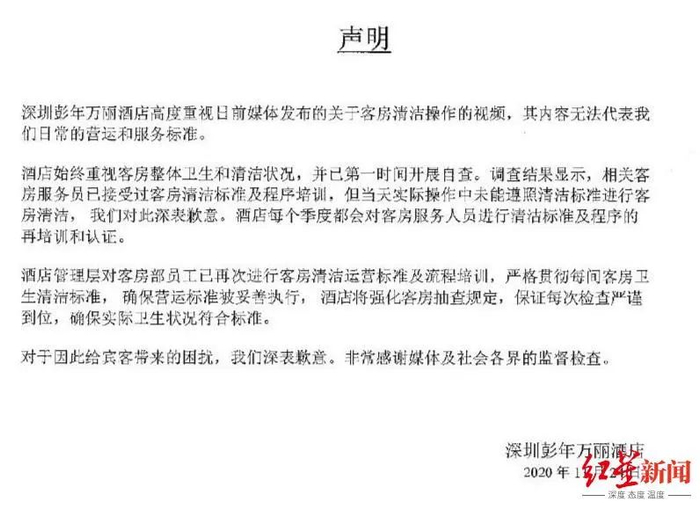 11月24日,深圳彭年万丽酒店官方微博发布声明称,客房服务员当天实际操作中未能遵照清洁标准进行客房清洁,酒店对此深表歉意。目前,他们对员工进行再次客房清洁运营标准及流程培训。