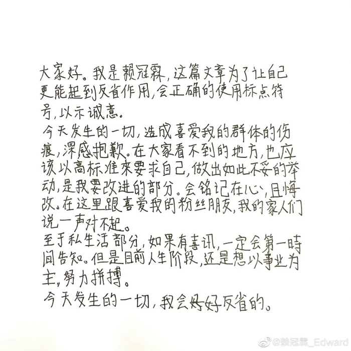 11月24日,歌手、演员赖冠霖就此前被拍到一边抽烟一边随地吐痰的不文明行为发文道歉,他称,“很抱歉,我作为公众人物没能约束自己的行为,做了错误的示范。我会接受大家对我的批评,并引以为戒,绝不再犯。”24日晚发布了道歉手写信。