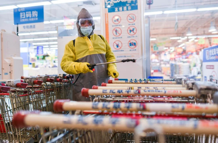 超市工作人员对购物车进行消毒。新民晚报记者 陈梦泽 摄