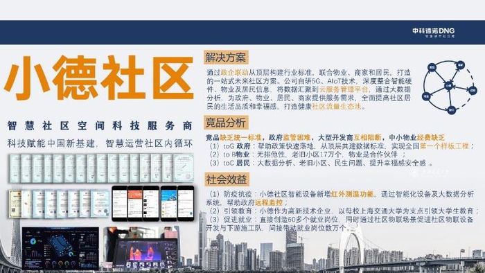 项目简介: 小德社区,是人工智能、物联网等新技术集成应用的智慧社区,通过政企联动,从顶层构建行业标准,联合物业、商家和居民打造一站式未来社区方案。公司自研5G、AIoT技术,深度整合智能硬件、物业及居民信息,将数据汇聚到云服务管理平台,通过大数据分析,为政府、物业、居民、商家提供服务需求。通过小德app进行社区管理规划,全面提高社区居民的生活品质和幸福感,帮助政府政策落地,提升物业监管效率,营造便捷的社区周边生活环境,打造健康社区流量生态池。