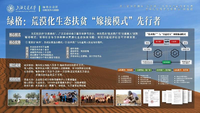 项目简介:本项目从公益行动出发,经实践逐步探索中国西北部地区的治沙破题思路。项目立足于“技术推广”和“公益育人”的双轮驱动模式,不断的发动沙区和非沙区社会力量参与治沙。其中,项目所采取的“固沙植物嫁接经济作物”的治沙技术已经在多地落地,公益育人也卓有成效。目前已经被新闻联播、光明日报、学习强国等多家媒体报道。在未来,绿格将进一步落实“双轮驱动”模式,为沙区可持续发展不懈奋斗。