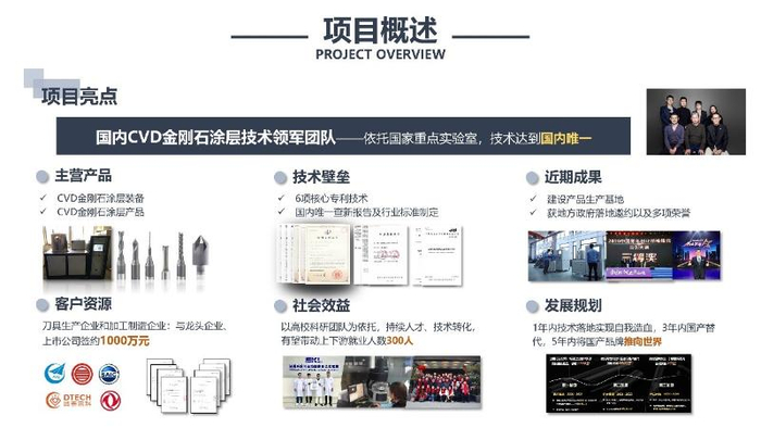项目简介:高性能CVD金刚石涂层是应用于机床切削刀具的一种先进碳薄膜材料,该涂层能大幅提升刀具的使用寿命,对我国高端制造业的发展具有深远的战略意义。但是我国在该领域长期受制于国外巨头公司的技术封锁,国内使用的高端金刚石涂层刀具产品均为进口,国产化替代已经迫在眉睫。上海交通大学金刚石研发团队致力于金刚石涂层装备及工艺配方研发20余年,其中,涂层装备已完成4代产品迭代,开发的涂层工艺配方高达20余种,目前已具备打破国外技术封锁的要素条件。