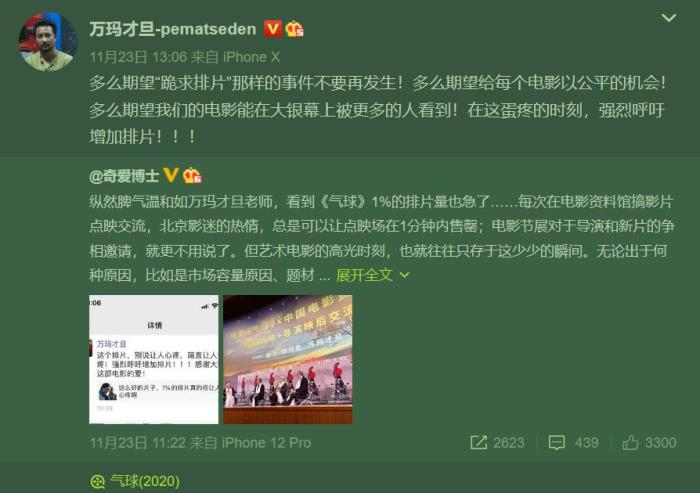 导演万玛才旦在微博强烈呼吁增加排片:“多么期望‘跪求排片’那样的事件不要再发生!多么期望给每个电影以公平的机会!多么期望我们的电影能在大银幕上被更多的人看到!”