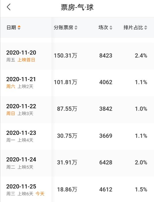 11月20日,电影《气球》正式上映,豆瓣评分7.9,首日排片占比为2.4%,但接下来的两天便跌至1.0%,截至目前票房累计400余万。
