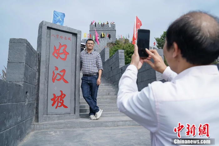 23日,到“八字岭观光长城”游览的游客络绎不绝。人们纷纷在“八字岭长城”的“好汉坡”合影留念。