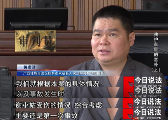 由于紧急刹车的惯性,救护车里的谢小姑被甩出担架,并滑到前方座椅的两腿之间。此时,谢小姑身体与地面呈45度角,头被卡在座椅下面不能动弹。医护人员想办法将谢小姑从座椅下面拉出来并安置好,救护车再次启动开往医院。
