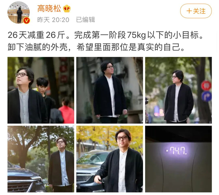 11月24日,高晓松在社交平台上晒出一组近照,自曝:"26天减重26斤。完成第一阶段75kg以下的目标。"