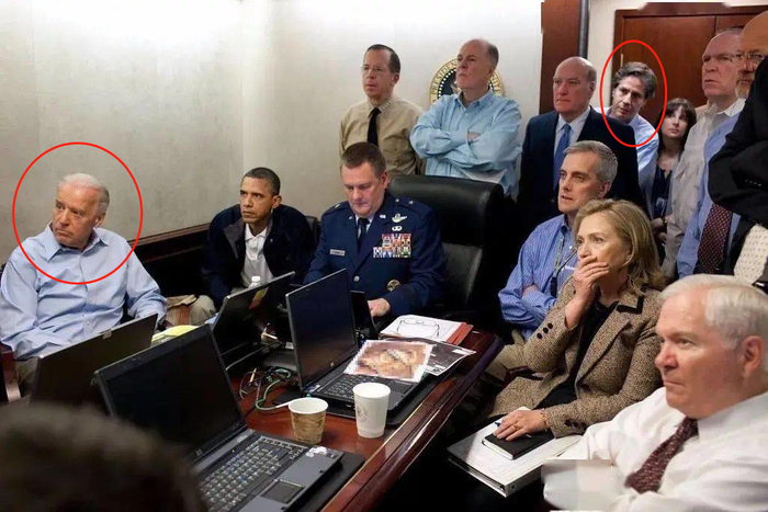 2011年5月,白宫战情室。时任总统奥巴马(左起第二位)紧盯大屏幕,与白宫一众高官关注着袭杀“基地组织”头目本·拉登的行动进展。在他右手边,坐着如今的当选总统拜登。而与拜登同样身着浅蓝色衬衣的布林肯,正从照片中央偏右的位置探出头来盯着前方。