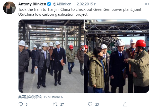 2015年访华的布林肯乘高铁去天津参观低碳项目,并发在自己的社交媒体上。 来源:Twitter