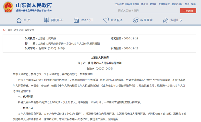 “预计今后15年,我国将进入急速老龄化阶段,特别是我省,是全国唯一一个老年人口超过2000万的省份,2019年底全省老年人口已达2325.21万,老龄化率23.09%,到2035年预计老年人口占比将超过30%,进入深度老龄化社会。”省政府办公厅副主任张连三表示,老年人在出行过程中,存在着省与省之间、省内市与市之间老年优待政策不统一、证件不互认等问题,给老年人带来了不便。为省内老年人和省外来鲁老年人提供统一的、更加便捷的公共服务,我省制定了进一步优化老年人优待工作的政策措施,将于2021年1月1日起正式施行。