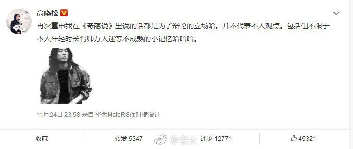 高晓松还发了一张年轻时照片并配文:“再次重申我在节目里说的话都是为了辩论的立场哈,并不代表本人观点。” 来回应此事。