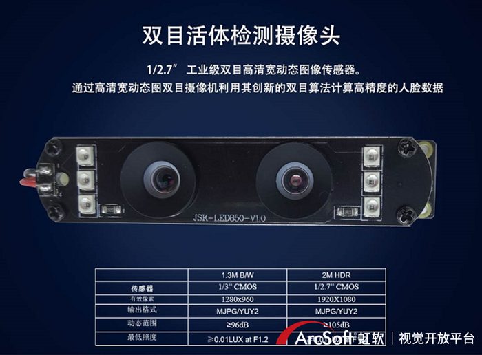 因此相对单目摄像头,双目摄像头在对抗假脸攻击的防御能力上,更胜一筹。比如金视康热卖的500万双目宽动态人脸识别摄像头就采用了虹软免费ArcFace算法的IR双目活体技术,基于红外成像原理及深度学习算法的高鲁棒性,其对于纸质照片、屏幕照片的防御力相当优秀。