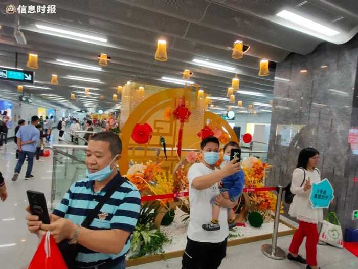 其中,在同德站站厅,“空中”飘满了“同心灯”,与中部垂直电梯处的“同心结”相呼应,不少街坊驻足拍照,对于同德站的装修风格,街坊黎小姐点赞说道:“这样的装饰布置很用心、很有特色、很有代表性。”