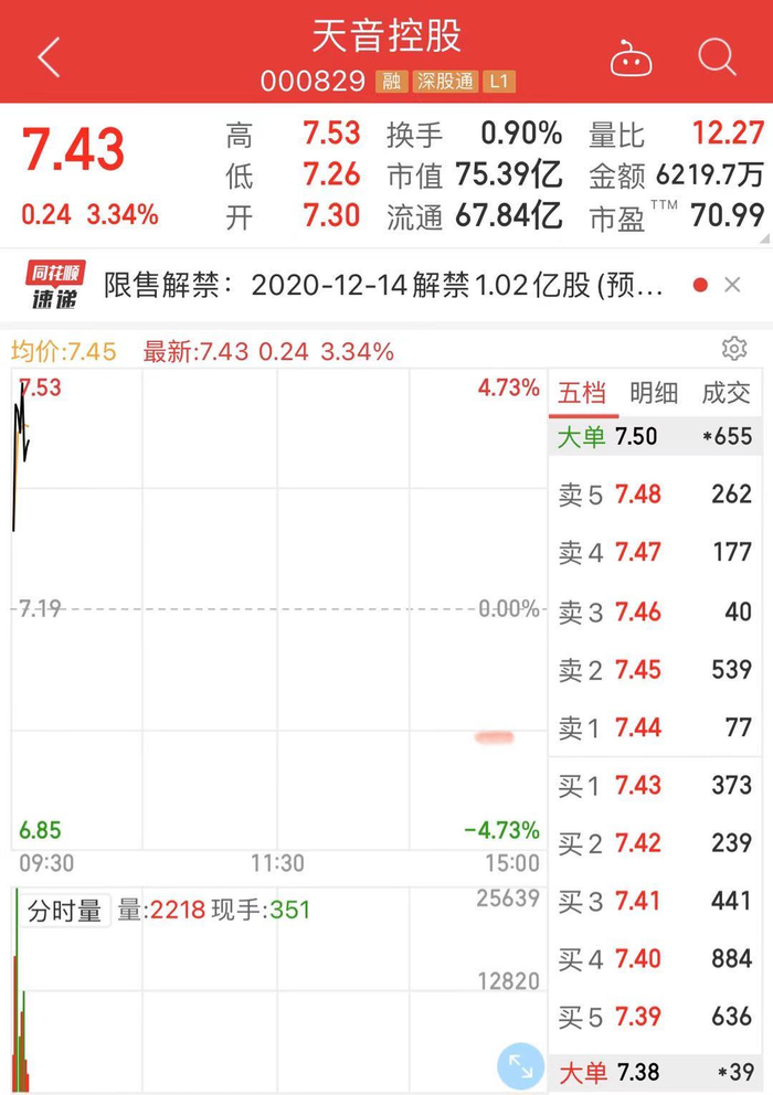 11月26日早盘,天音控股高开,截至发稿,涨逾3%,报7.43元。