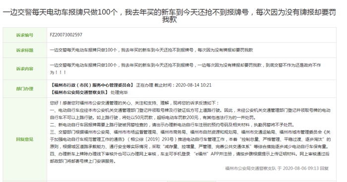 (福州交警在牌号申请难诉求件中的回复)