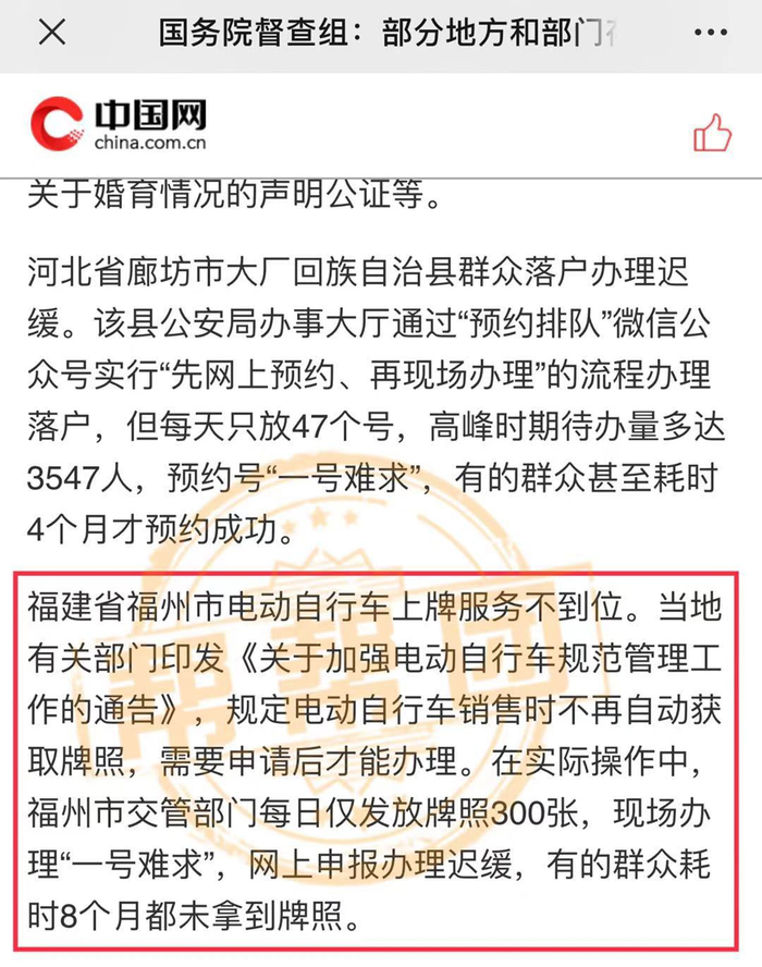国务院督查组通报!福州电动自行车上牌服务不到位