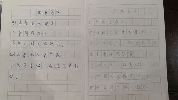 “好!1、有相chí了,2、积极主动进攻了”“一duǎn一长,人上去cuō”“要注意一上来打信心要足。还要注意发球要转,这样我们一开始就能领先蛮多”……从一年级起,闵鸣就开始在一些训练和比赛后,自己写训练总结。这还是他自己悄悄写了一阵后,爸爸妈妈才发现的,着实令他们惊喜。起初,字迹还有点歪歪扭扭,不会写的字,就用拼音代替。渐渐地,句子长了起来,分析也越来越在理。妈妈“爆料”,唯一不足的是,有时候丢三落四,会忘记本子藏在哪,只能重新再拿一本。