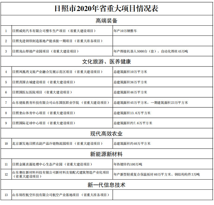 今年,日照还有13个项目入选2020年省重大项目,总投资609.5亿元,2020年度计划投资143.6亿元。13个项目涵盖高端装备、文化旅游、医养健康、现代高效农业、新能源、新材料、新一代信息技术等产业领域,属于山东省新旧动能转换十强产业和日照市十大专项范畴。