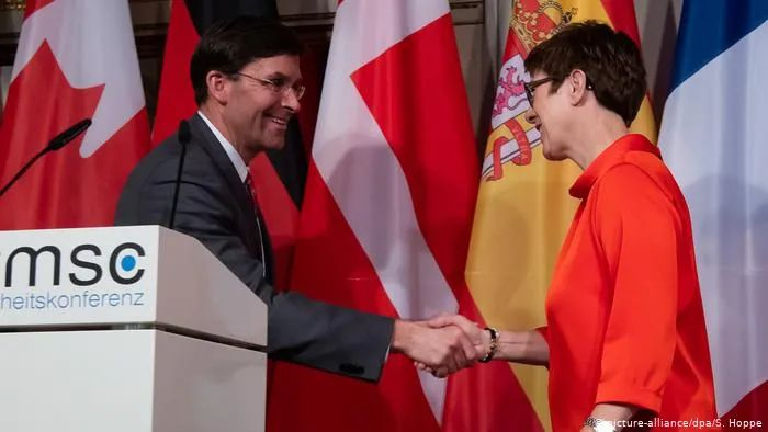 2月,德国防长卡伦鲍尔(右)与时任美国防长埃斯珀在慕尼黑安全会议上握手。GJ图