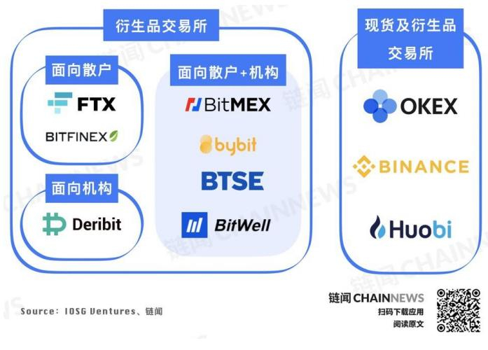 IOSG Ventures 曾发布报告表示,在交易所的用户定位上,头部现货交易所大多提供衍生品交易所的交易模块,用户可以直接在中心化的现货交易所进行衍生品的交易;而衍生品交易所则专注于衍生品的发展,并将业务进一步细分为面向散户和机构。