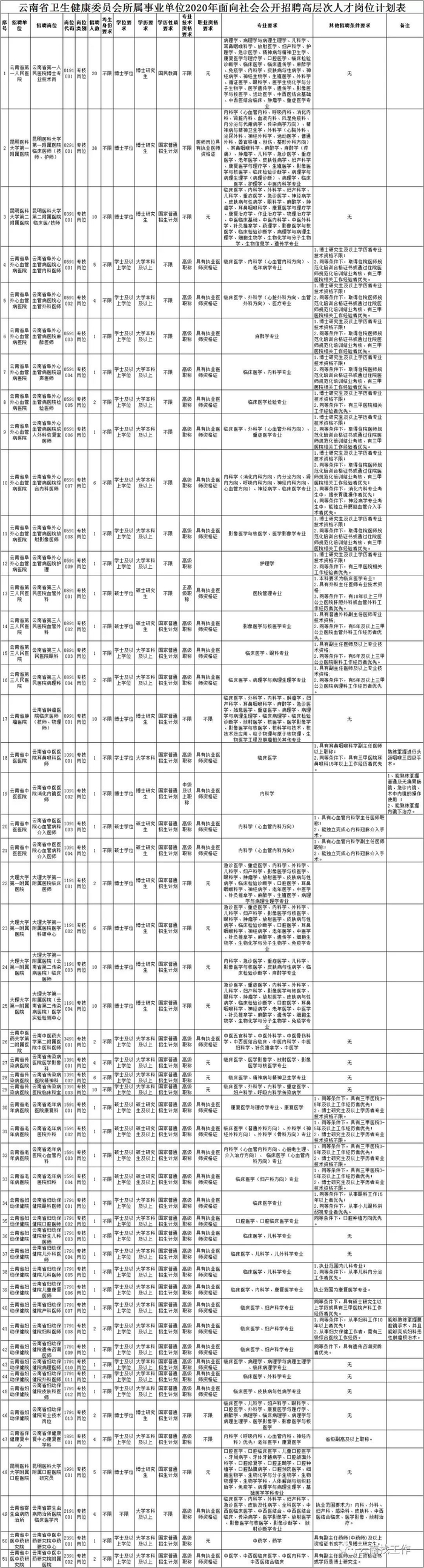 各单位招聘岗位及招聘条件,详见《云南省卫生健康委员会所属事业单位2020年面向社会公开招聘高层次人才岗位计划表》。