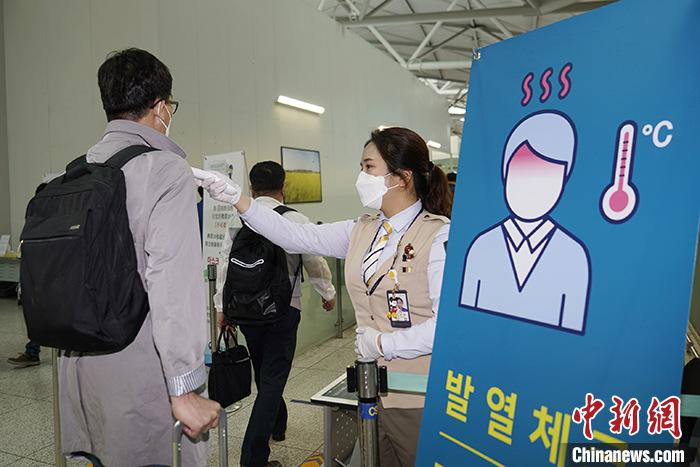 资料图:5月10日,210多名韩国企业员工启程前往中国天津复工。他们是首批申请通过“快捷通道”入境中国的韩方人员。图为仁川机场,韩企员工登机前接受体温检查。 中新社记者 曾鼐 摄