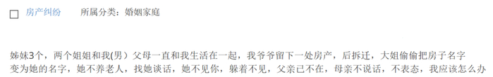 我有两个姐姐,她们一直和我(男)父母生活在一起。我爷爷留下一处房产,去世后没有留遗嘱,后来拆迁了,大姐偷偷把房子名字改为她的名字。但她不赡养老人,找她谈话也不露面,现在父亲已不在,母亲也不表态,我应该怎么办?