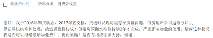 首先,根据你的描述,房屋在交房前就已经开始漏水,且你是明知存在质量问题的情况下签署的收房协议。对于房屋质量问题及开发商未及时返修给你带来的损失,你可以要求开发商承担违约赔偿责任。目前你遇到的房屋质量问题返修系开发商所应承担的义务,但并不在物业公司所承担的服务范围之内,因此业主以此为由拒交物业服务费没有相关依据。