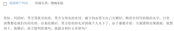 未婚同居时,男方贷款买的房,购房合同写的他的名字,男方父母出的首付,剩下的由男方自己分期付,日常消费都是我们共同负担。后来结婚后,男方给的彩礼存到我个人名下了。如今由于婆媳矛盾,夫妻感情出现裂痕。我想请问,离婚后孩子能判给我吗?我能得到什么补偿?