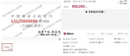 11月24日到11月25日,重庆市渝北区人民法院在阿里司法拍卖平台,对被执行人蒋某的电话号码13xx3888888的使用权进行拍卖,起拍价30万元,经过240次竞价,最终自然人仇某以85万元拿下,较起拍价30万元,高出183.33%。