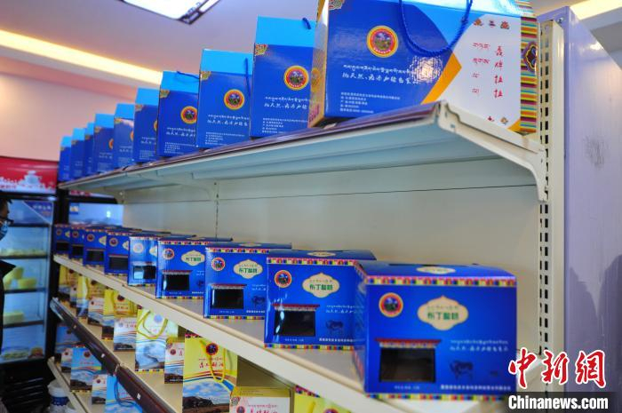 图为8月11日,西藏那曲市聂荣县色庆乡杂玛多种经营合作联合社根据城乡消费群体差异化需求,创新研发的果酱布丁酸奶、真空酥油等产品摆放在货物架上。色庆乡统筹全部28个行政村的合作社,通过政府引导、民众参与模式成立合作联合社,建立了完整的牧业全产业链,5座牧场总面积超过6万亩,牲畜近3000头,畜产品日加工能力5000斤,直接带动200多名牧民就业(资料图)。 张伟 摄