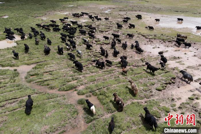 近年来,那曲市班戈县推行村级牧业经济合作社,牧民们将牛羊及草场作为股份加入合作社,部分牧民开始从事旅游服务、服装加工及运输等行业,收入逐年提高。图为8月3日,班戈县的牦牛群在一片草原湿地中觅食(资料图)。 江飞波 摄