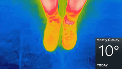 穿了量橙的鞋子已经热到红里发白了。而普通加绒运动鞋只是保存了体表温度表现为红色,但表面温度已经完全蒸发。周围更是微微发绿,脚更是冷到发麻了。