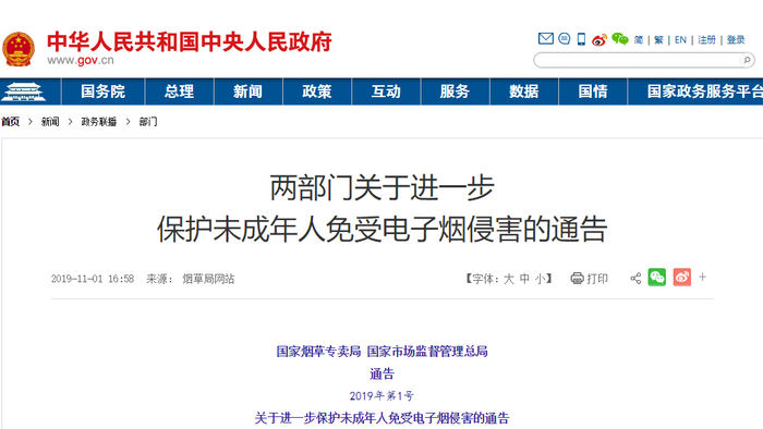 2019年11月,国家市场监督管理局和国家烟草专卖局再次发布《关于进一步保护未成年人免受电子烟侵害的通告》,该通告要求,敦促电子烟生产、销售企业或个人及时关闭电子烟互联网销售网站或客户端;敦促电商平台及时关闭电子烟店铺,并将电子烟产品及时下架;敦促电子烟生产、销售企业或个人撤回通过互联网发布的电子烟广告。
