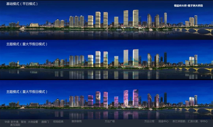 针对湘江两岸照明,以“增”为主,以“提”为辅,通过地标建筑单独设置规则,功能属性决定光色,视觉影响力决定亮度层次。四组团将以顶部天际线为重点,立面照明严格把控,避免亮度、彩度过度,同时分为平日基础模式、重大节假日主题模式,形成重点建筑主题模式联动。
