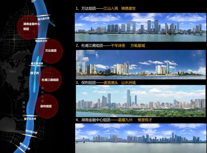 四组团:万达组团、杜甫江阁组团、保利国际广场组团、湖南金融中心组团;