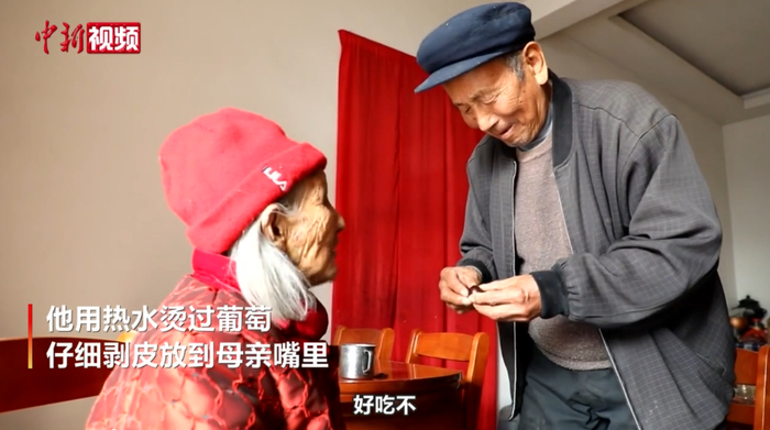 原标题:菏泽85岁老汉给111岁妈喂水果:“我老了娘还在是最大的福....”